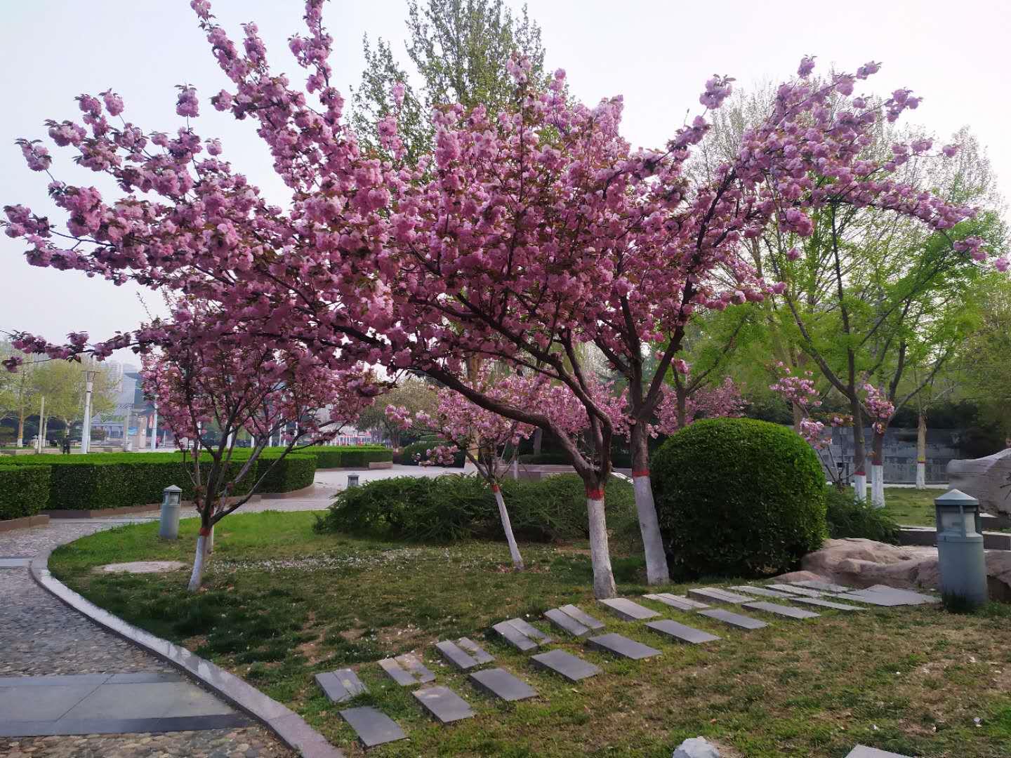 广场东侧有一小山坡,坡上步石旁边有几株樱花开得正浓,许多花朵拥簇在一起,粉红粉红的花朵挂满了枝头,很是壮观。