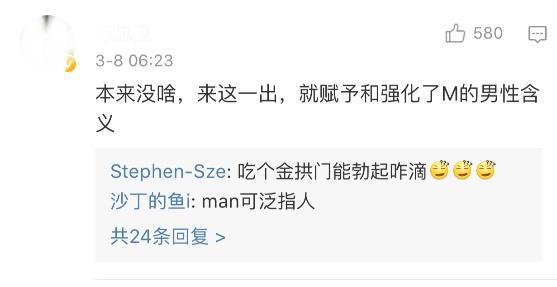 同时也有网友表示:本来没什么,这样一来,就赋予和强化了M的男性含义。
