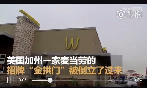 据美媒报道,位于美国加州林伍德市的一家麦当劳的招牌"金拱门"被倒立放置在马路边上