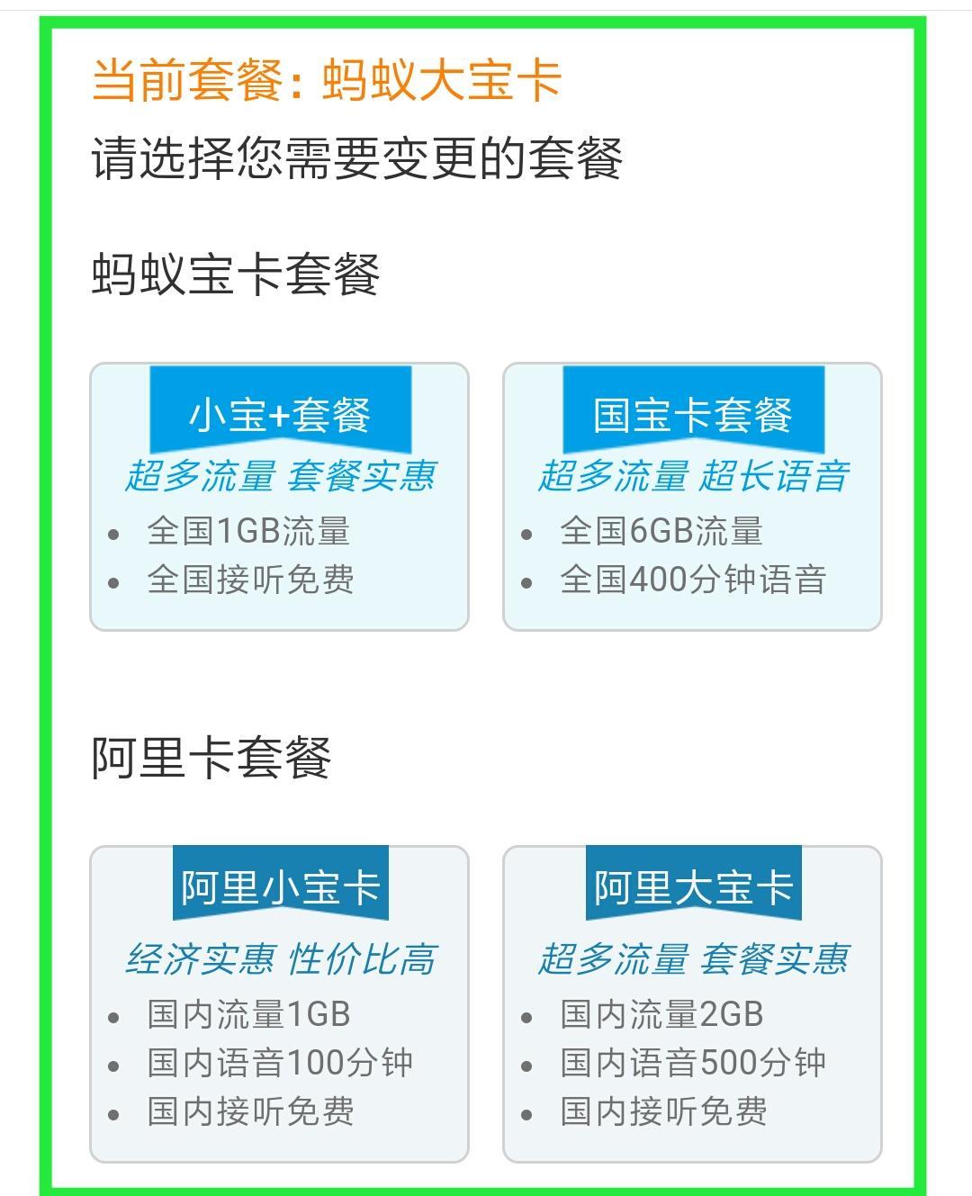 其次,在中国联通手机营业厅APP中,点击换套餐,会发现共有4种套餐,分别为蚂蚁宝卡2种和阿里宝卡2种,用户可以任意选择而进行更换。