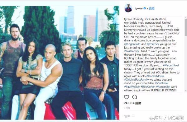 ▼泰瑞斯吉布森先前在IG上骂对方是小丑,强调《速度与激情》系列的中心主旨都是在传达“家族”、“团结”,因巨石强森的加入而变了调,后续也引起巨石强森的回覆,引发口水战。