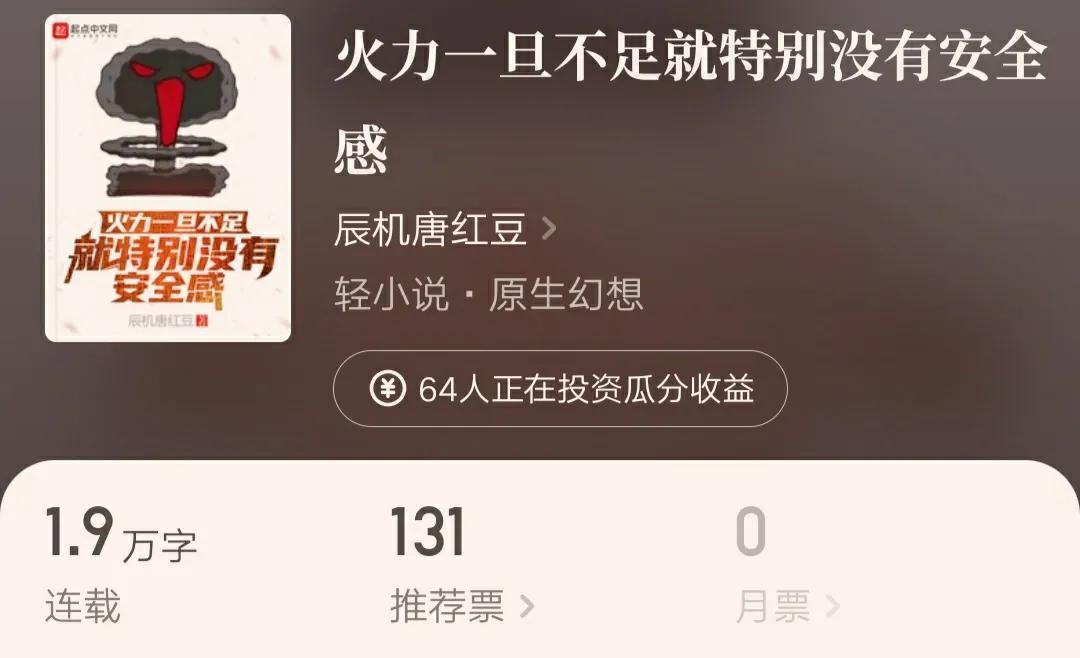 在消失了一年之后,“辰机唐红豆”再开新书,起名为《火力一旦不足就特别没有安全感》,这个书名很长,但却是作者目前状态的写照,所以作者能否凭借这部小说再次给读者带来“安全感”,还需要我们拭目以待。