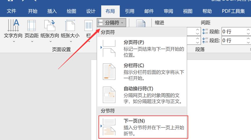 第二步:点击【布局】选项卡下的【分隔符】按钮,选择下一页分节符。
