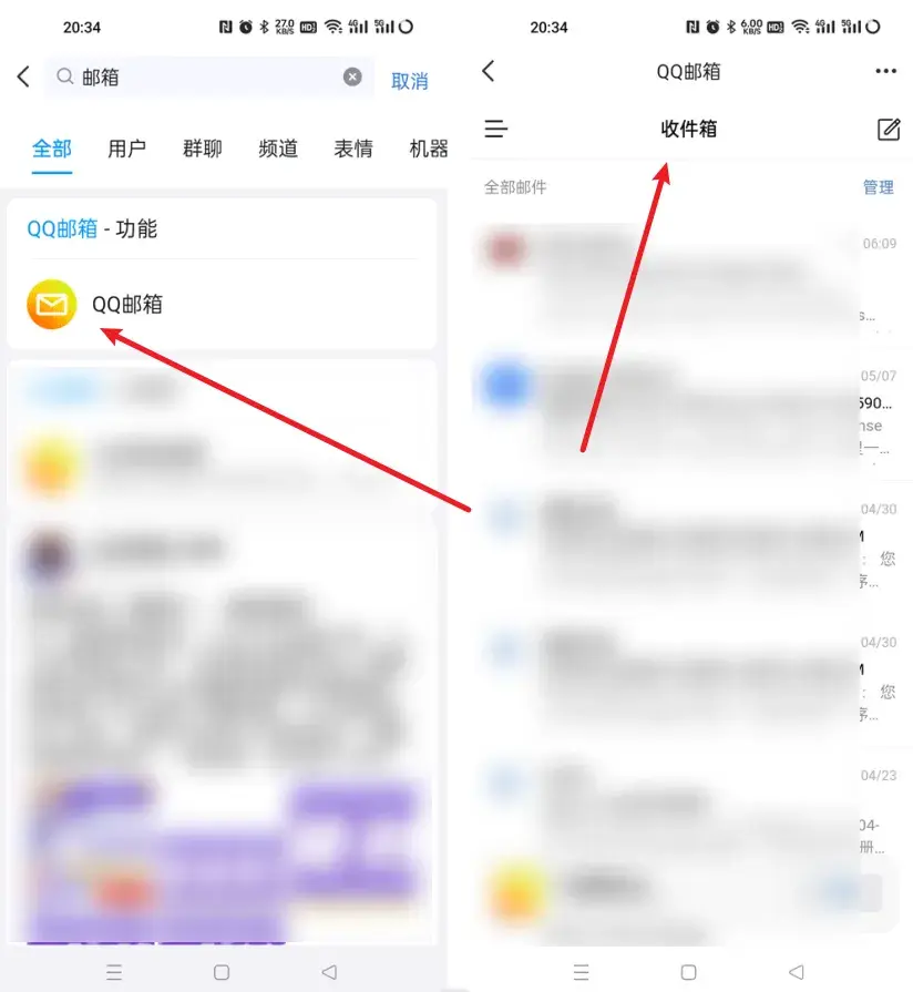 1、打开我们的手机qq,然后在消息中找到顶部的【搜索框】,接着输入“邮箱”后点击【搜索】;