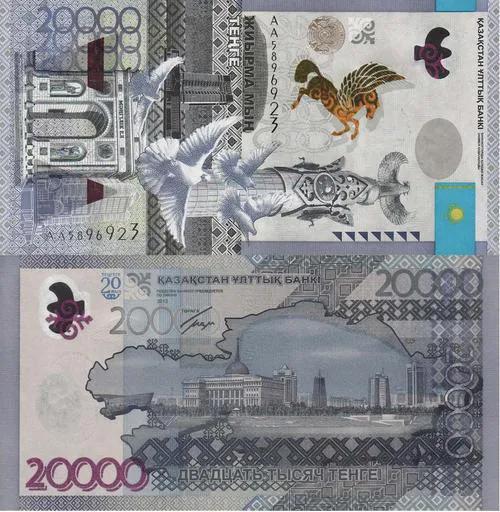 哈萨克斯坦坚戈的纸币面值: 200、500、1000、2000、5000、10000、20000,硬币有1、2、5、10、20、50、100。