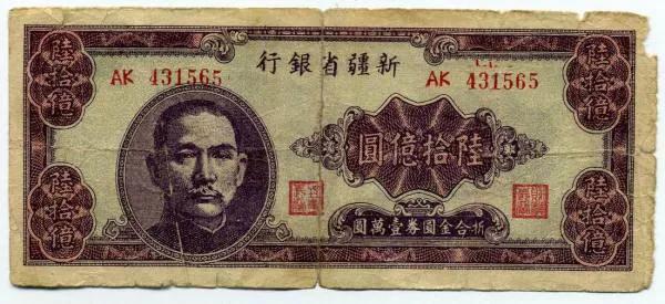 60亿金圆券于1949年5月10日,由中华民国新疆省银行发行(当时新疆称“省”而非现在的“自治区”),是中国历史上面额最大的纸币,在当时的物价环境下,只够买两个馒头。