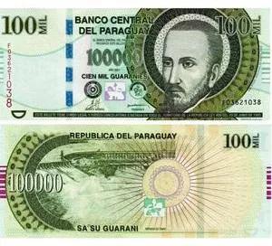 巴拉圭瓜拉尼为巴拉圭的流通货币,流通的纸钞有1、5、10、50、100、500、1000、5000、10000、20000、50000、100000瓜拉尼等面额,硬币则有1、5、10及50瓜拉尼等。