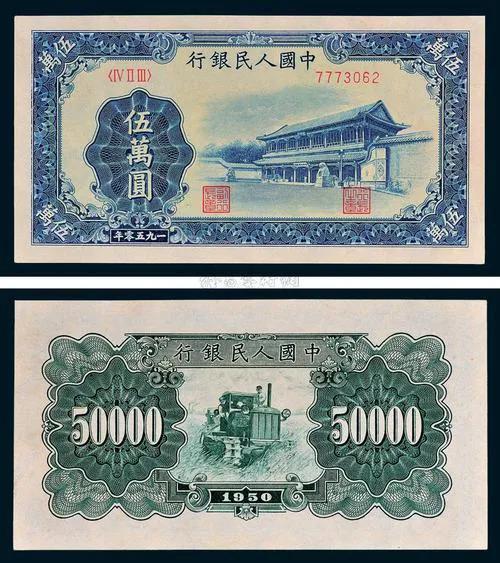 50000元人民币于1950年发行,新中国成立之初,面对的是满目疮痍百废待兴的国家,通货膨胀急剧发展的经济,为了解决这些棘手的问题,我国央行发行了第一套人民币,力挽狂澜。
