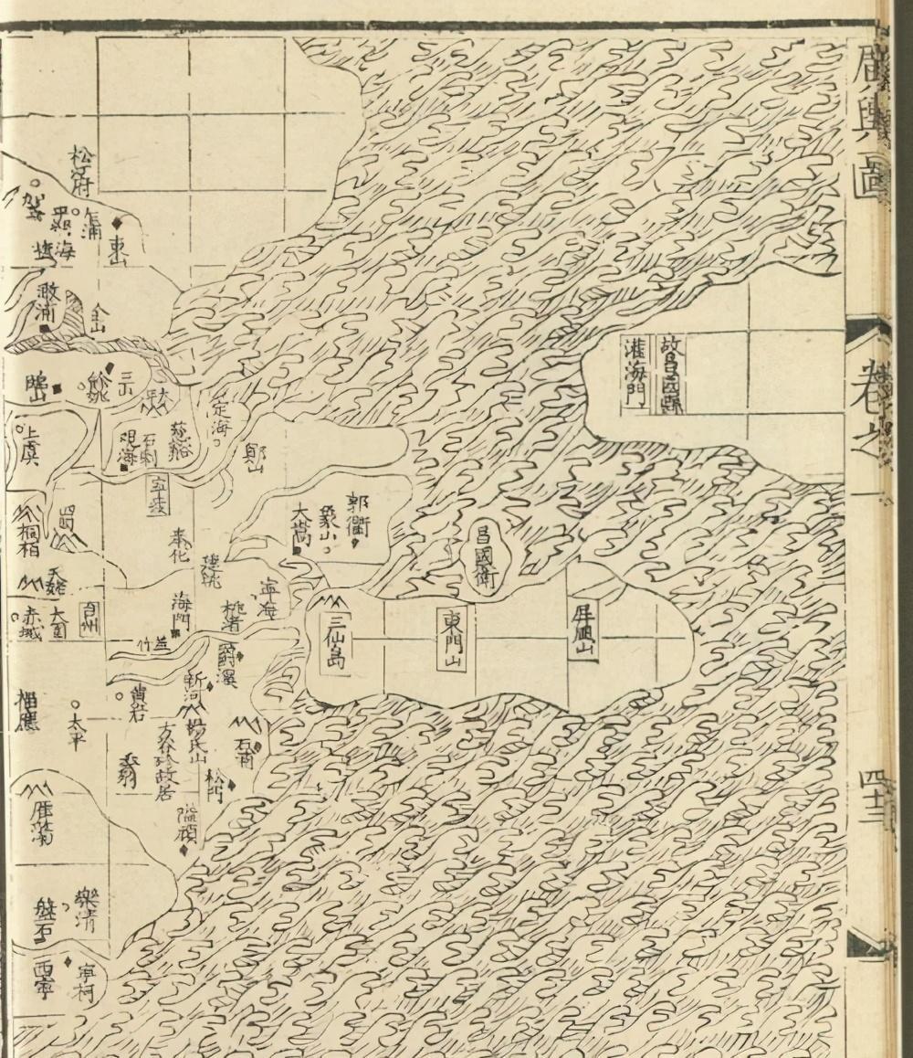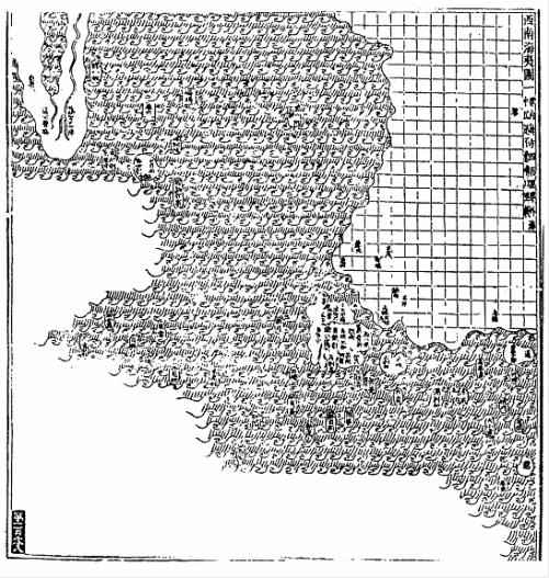 第二,当时倭乱已经非常严重,因此意图通过绘制地图来为国家出谋划策的罗洪先应当不会对此坐视不管,但《广舆图》中除了《海运图》之外,并没有专门的海防图,这点实际上有些让人感到意外。对后世海防图绘制影响极大的郑若曾的《筹海图编》成书于嘉靖三十五年(1556),恰好是在《广舆图》初次刊刻的第二年,因此很可能是因为当时没有罗洪先感到满意的海防图可以使用(郑若曾之前编绘的《沿海图》应当还比较粗糙),因此在《广舆图》中也就没有收录这方面的内容。