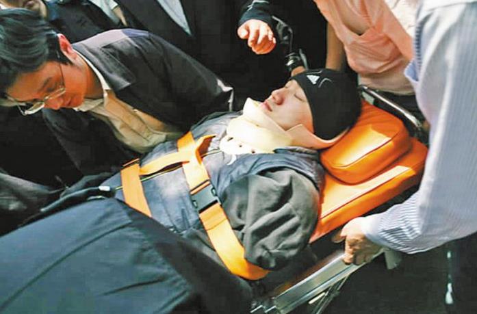 这一下他躺在地上站不起来了,队友和教练急忙将他送往医院。