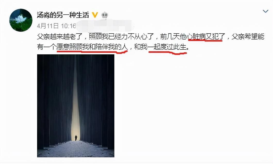在去年四月,汤淼发微博称父亲年事已高,还患有心脏病,照顾他已经力不从心了。