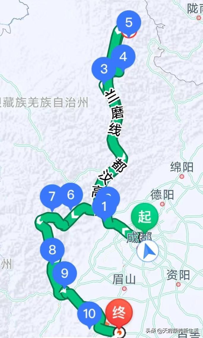 途径四川的:成都市、阿坝藏族羌族自治州、雅安市、眉山市、乐山市;沿途推荐4个便利服务区:绵虒服务区、三叉河停车区、瓦屋山服务区、三宝停车区。