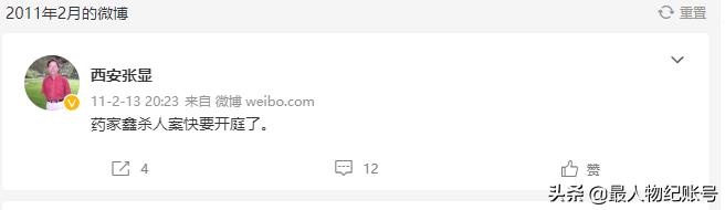 2011年2月13日,张显发了第一条微博:药家鑫杀人案快要开庭了。