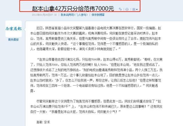 传闻说,在一场演出中,赵本山得到42万报酬,分到范伟那里的,只有7000元。