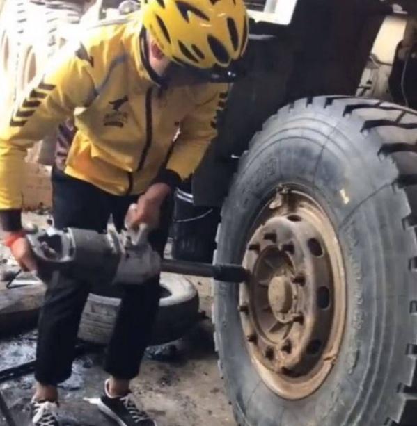 外卖小哥在给大货车上轮胎,还别说,这外卖小哥的姿势还怪帅气。
