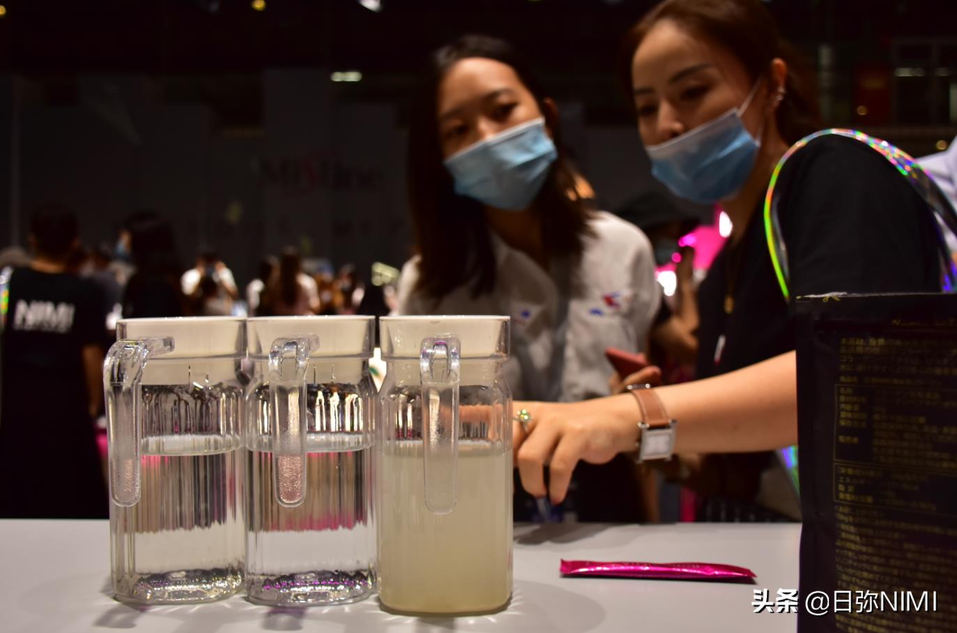 夏天七月份的时候,我还专门去了上海美妆博览会日弥的展位参观。现场有日弥和其他品牌的胶蛋白的对比。的确在溶解的时候,日弥的胶原蛋白速度快,而且最后溶解完的水体非常澄澈,跟之前这杯清水看起来、闻起来都没有什么差别,但是旁边几杯其他品牌(其他品牌其实也都是大牌)的就会有点显黄色,还带有一种明显的腥味。