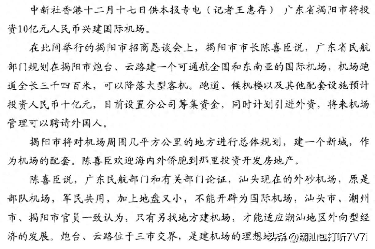 1992年12月17日,中国新闻社香港分社发了一条在当时并不起眼的消息,整条消息不足400字,标题为《揭阳将建国际机场》,副题为《选址在潮汕揭三市交界处的炮台云路,投资10亿元》,全文如下: