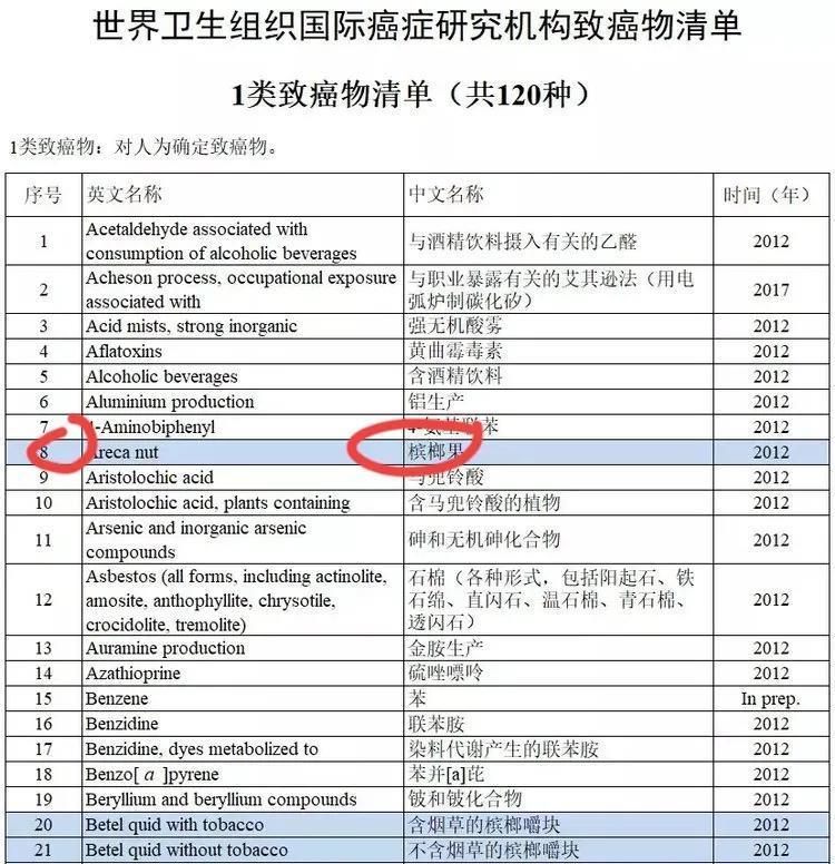 其实,早在2003年,世界卫生组织便将槟榔列为一级致癌物。在2017年,国家食药监总局发布了致癌物完整清单,更是把槟榔果列为一类致癌物。