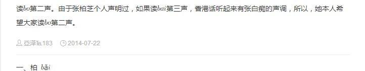 周星驰的喜剧之王曾是张柏芝是电影荧幕首秀,记得从那往后的一段时间里,人们都叫她张柏(bai三声)芝,再之后的很多年到现在,出现了一个普遍的现象,就是当自己或身边的人叫出张柏(bai三声)芝这个名字时,总是会有人蹦出来说那叫张柏(bo二声)芝,还经常有人因此争论不休,直到我们在广大媒体上不断的听到张柏(bo二声)芝这个名字,很多人才很别扭的更正了叫法,直到最近发现网上很多网友给出了这样的答案,说张柏(bai三声)芝在粤语发音里听起来像是张白痴,所以张柏芝本人声明希望大家读“bo二声”这个音。