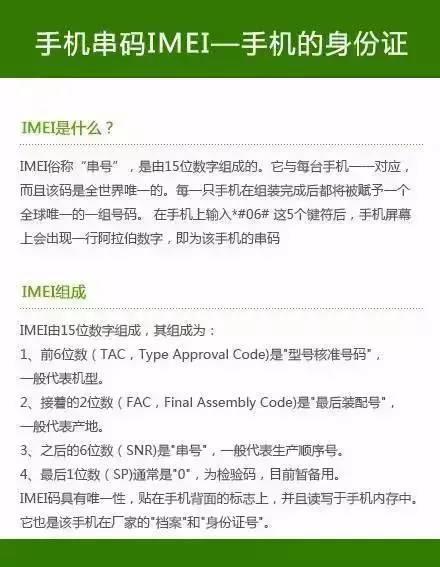 当手机被盗的时候,如知道IMEI码,可以通过手机供应商进行手机锁定,即:获知被盗之后的手机号码,中止手机的通话功能,获知手机的方位。