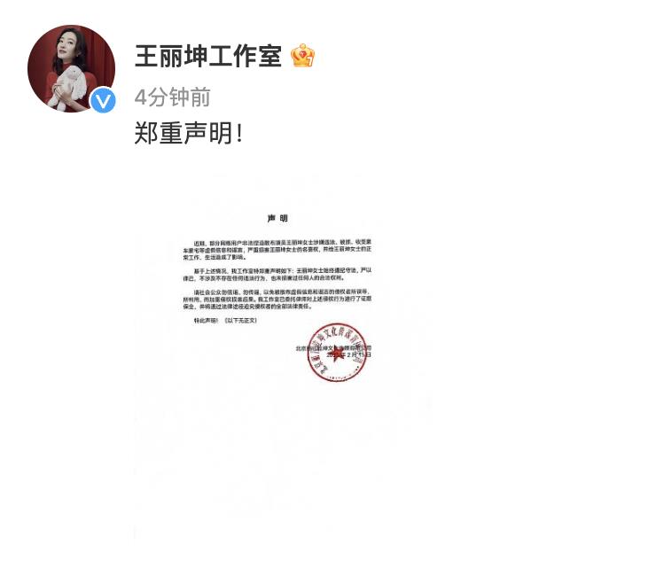 #王丽坤工作室声明# 2月15日,王丽坤工作室发布严正声明,称近期部分网络用户非法捏造散布演员王丽坤女士涉嫌违法、被抓、收受豪车豪宅等虚假信息和谣言,严重损害王丽坤女士的名誉权,并给王丽坤女士的正常工作、生活造成了影响。工作室郑重声明:“王丽坤女士始终遵纪守法,严以律己,不涉及不存在任何违法行为,也未损害过任何人的合法权利。”