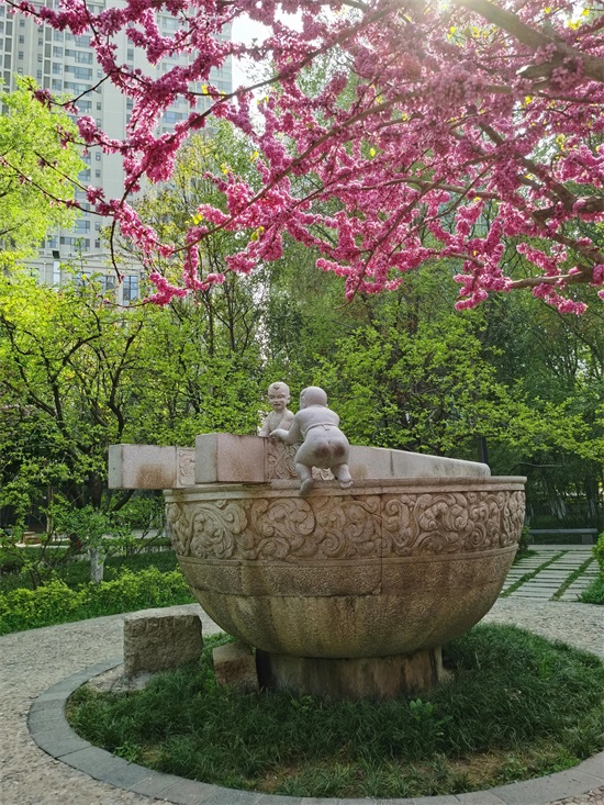 丰庆公园内有“食为天”雕塑,两个顽皮的胖娃娃趴在巨大的碗筷上嬉戏玩耍。这是老百姓最质朴的愿望——民以食为天。西安人喜欢这个雕塑,会把自己的娃也抱上去和两个福娃合影。久而久之,这里成了丰庆公园的标志性雕塑。