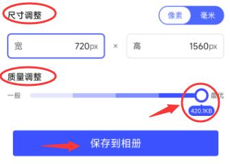 你可以调整照片的尺寸以及质量来更改照片的大小,在下图箭头所指出显示了一个kb大小,这就是你调整之后的照片kb,这也是你调整的一个依据,可以帮助你完美调整出你想要的kb大小,最后点击【保存到相册】即可,你可以在手机相册中找到更改大小后的照片了。