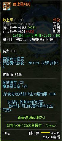 如果将武器换成魔魂霜月残短剑,BUFF等级会降到18级,31%的加成能涨幅到39%。但如果补上光环和鞋子的宝珠,那便是41%了,离46%的极限值便很接近了。