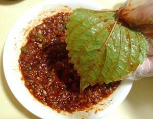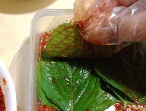 戴上一次性手套,取洗干净滤干水的苏子叶,用叶脉明显的一面,蘸上酱料,码在密封盒里。