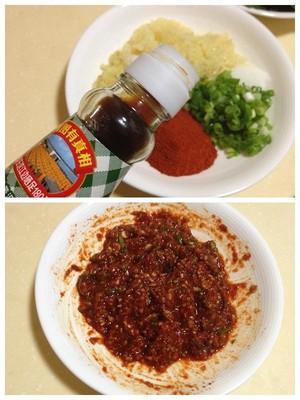 小香葱切葱花、姜和蒜切末,加辣椒粉、白糖、盐,加淡盐酱油拌匀,见下图。尝一下咸淡,不要放太淡了,因为加了苏子叶之后会变淡一些。如果家里有鱼露,也可以放1勺鱼露,同时减少一些盐。