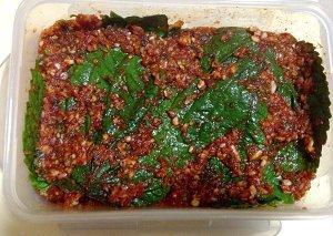 直到码完所有苏子叶,把剩下的酱料均匀抹在面上,全部用完。放冰箱冷藏3天就可以吃了。