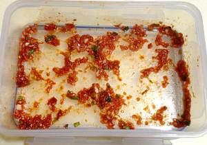 选一个能密封,无油无水的密封盒,在底部抹上步骤2的酱料。