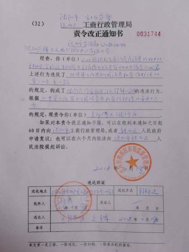 而就在最近,广告大咖VIVO,翻车了。4月18日沈阳工商部门——沈阳市铁西区市场监督管理局下发了一份《责令改正通知书》,勒令VIVO联销柜台停止引人误解的虚假宣传。