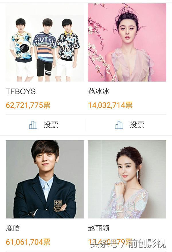 明星人气排名,男星TFBOYS第一,女星范冰冰第一
