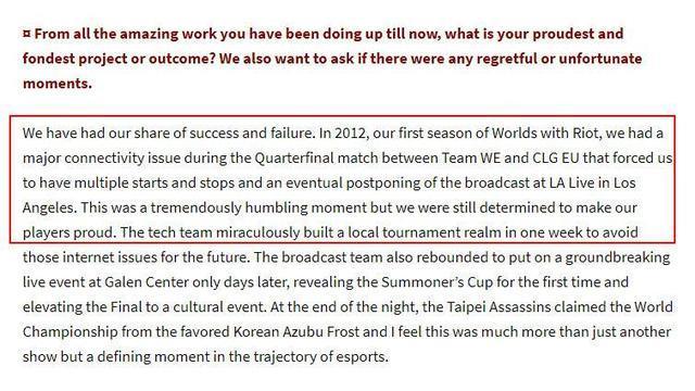 在回忆英雄联盟赛事这些年的变化时,拳头的全球执行制作人Ariel Horn在接受外媒采访时也感到非常的愧疚,据他描述,2012年的时候我们首次尝试做世界赛,但是在WE和CLG的那场比赛中我们出现了重大的网络事故,比赛断断续续,最终我们不得已将洛杉矶的现场直播推迟播出,这是一个极其尴尬的时刻,对此我们感到抱歉。