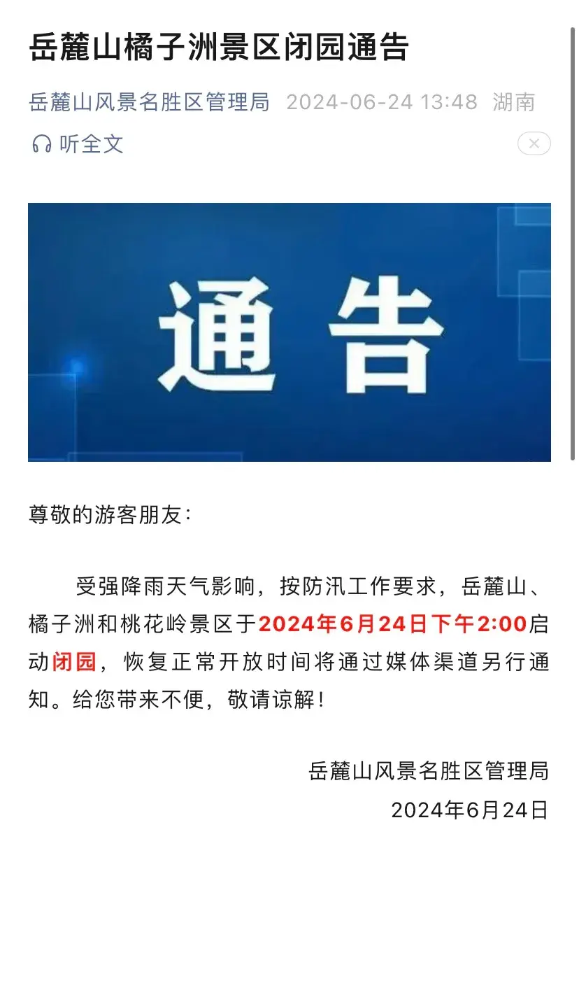 6月24日下午,岳麓山风景名胜区管理局发布通告:受强降雨天气影响,按防汛工作要求,岳麓山、橘子洲和桃花岭景区于2024年6月24日下午2:00启动闭园,恢复正常开放时间将通过媒体渠道另行通知。