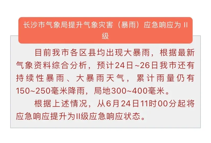 据长沙晚报,6月20日,航拍无人机拍摄到橘子洲头的亲水平台已被淹没,临水游步道也浸泡在水中。据长沙市气象局发布的消息,6月24日11时起,提升气象灾害(暴雨)Ⅲ级应急响应为Ⅱ级。目前长沙市各区县均出现大暴雨,根据最新气象资料综合分析,预计24日至26日,全市还有持续性暴雨、大暴雨天气,累计雨量仍有150~250毫米降雨,局地300~400毫米。