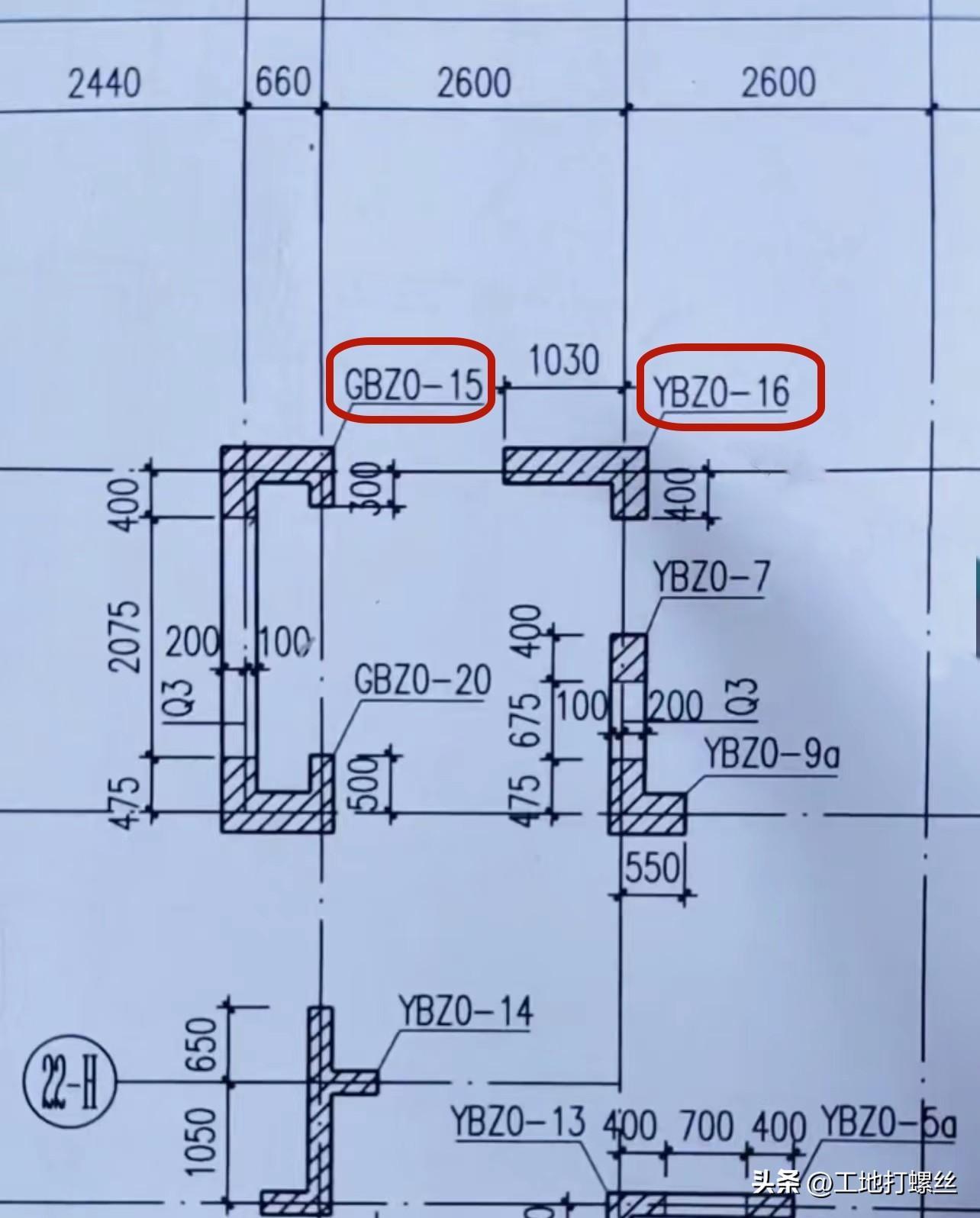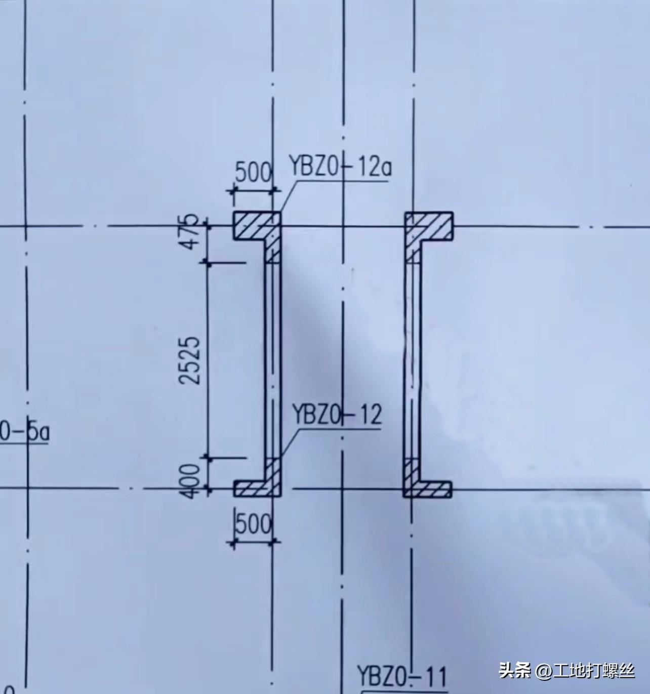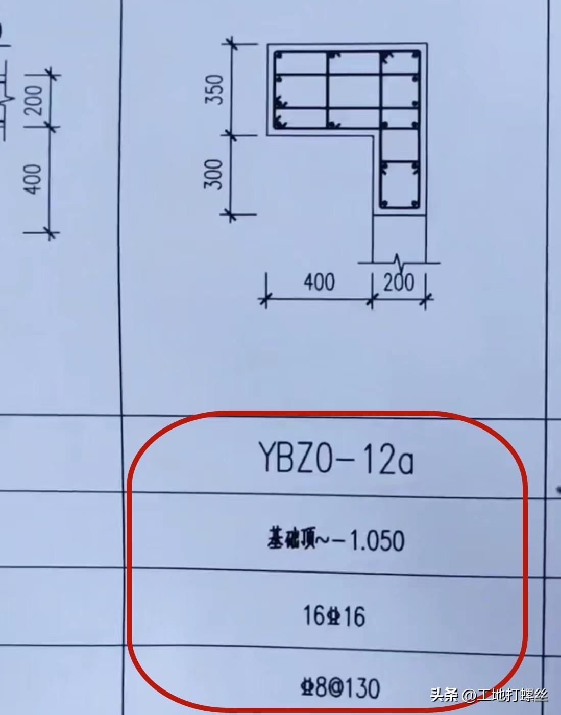 上图中红色框的GBZ、YBZ代表代号,GBZ代表构造边缘暗柱,YBZ代表约束边缘暗柱。今天我们以YBZ0-12a为例,来学习它的配筋应该怎么看,它的平面尺寸已经在图纸当中标出来了,如下图所示。