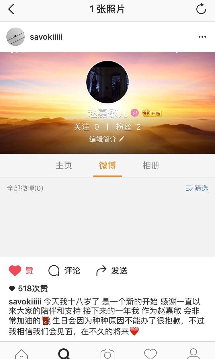并公布了一个全新账号@赵嘉敏儿 ,疑似为此前被公司雪藏的事情回应或退出SNH48组合,未来将以个人形式发展事业。(至于雪藏原因无外乎个人与团队发展方向不一致,各位可以自行百度一下)
