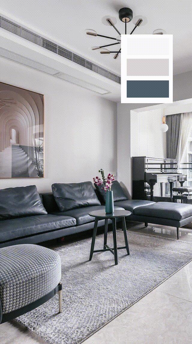 3、沙发、茶几、电视柜为主题色,占比3,则可以选择相近色,凸显出空间的氛围感。