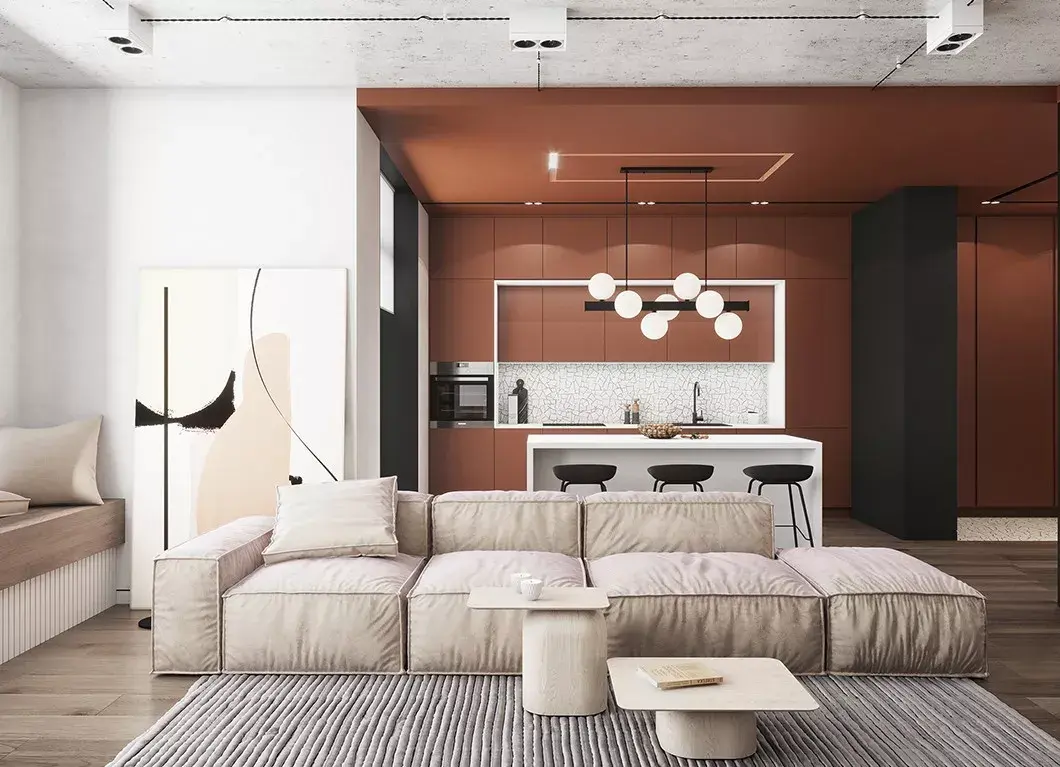 2、参照6:3:1的原理,地面、墙面、天花板为背景色,占比6,建议选择中性色,让空间更显美观性。
