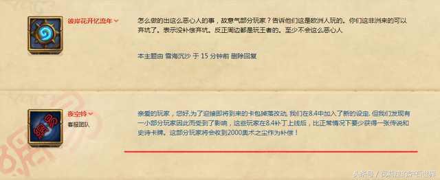 关注炉石传说的玩家都应该知道,炉石传说官方对于卡包掉落改动出现了BUG,给予了部分玩家2000奥术之尘的补偿。而那些玩家符合补偿条件,暴雪或者是网易都没有明确的给出说明。而这也导致了部分没有得到补偿的玩家不满。在炉石客服区就有很多玩家讨论这个问题。