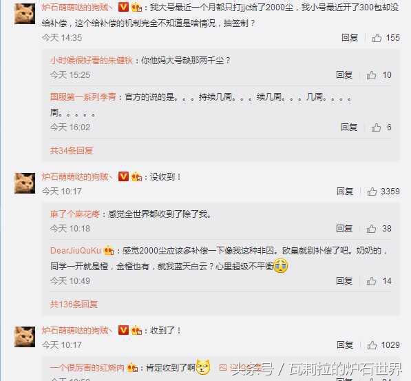小编这个月只开了竞技场卡包以及乱斗奖励卡包,收到了2000尘补偿。和我情况类似的炉石主播狗贼叔叔也是只开了竞技场卡包,同样收到了补偿。而狗贼叔叔另一个小号开了300包却为收到补偿。这说明补偿与否和开包多少无关。