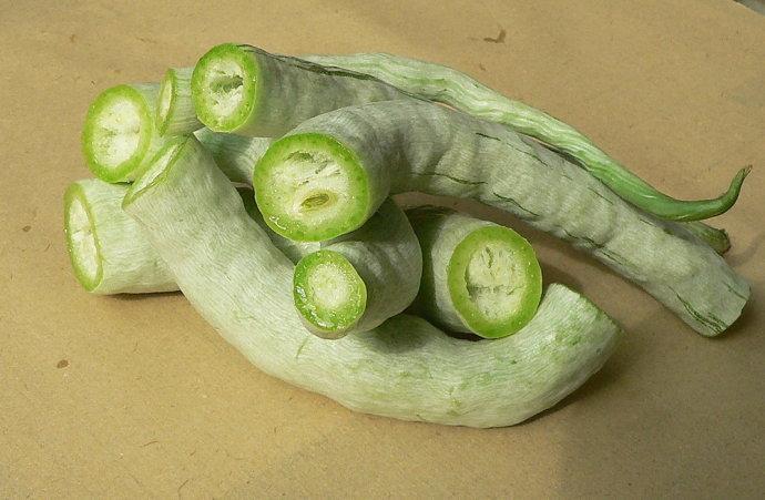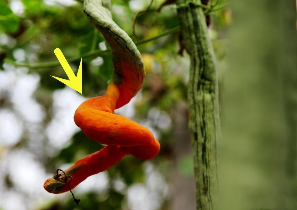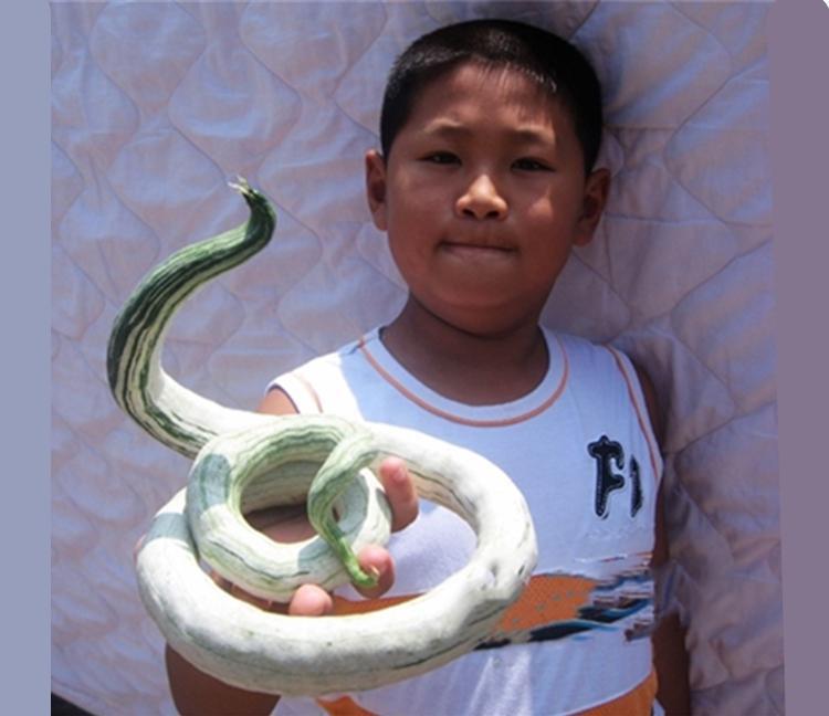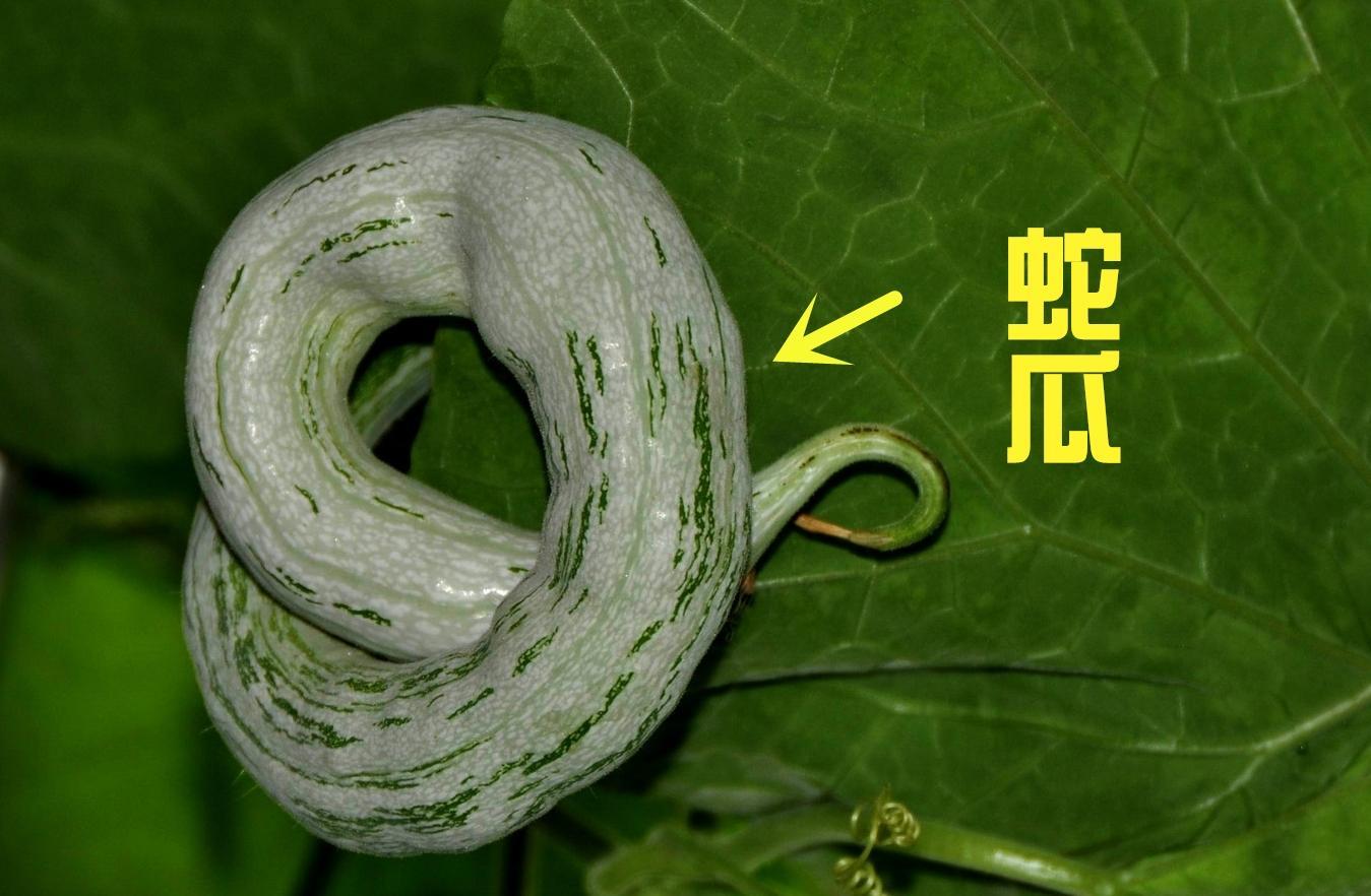 蛇瓜未成熟时,瓜皮浅绿色,像一条花白青蛇。蛇瓜成熟后,瓜皮局部呈现橘红色,像一条诡异的红花蛇。