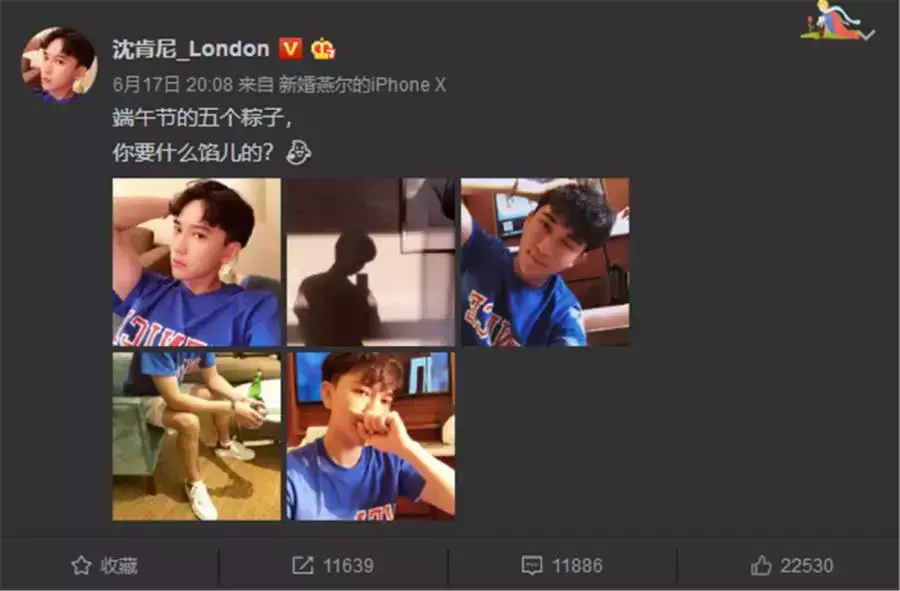 6月17日,沈肯尼在微博上晒出了婚后的第一次自拍,并配文道:“端午节的五个粽子,你要什么馅儿的?”