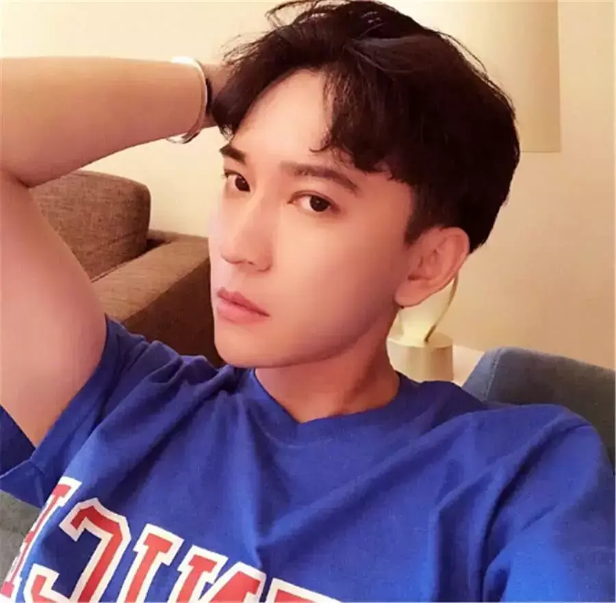 照片中的沈肯尼穿着蓝色短袖,帅气逼人。