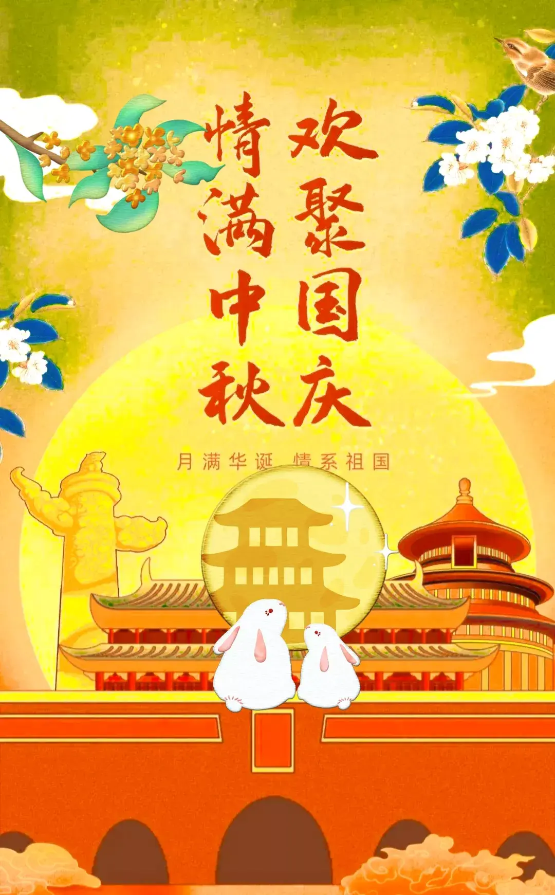 4:情满中秋,欢聚国庆,玉兔望月,桂花香飘十里,愿所有人合家团聚,我们亲爱的家国长盛,一年比一年更有实力!