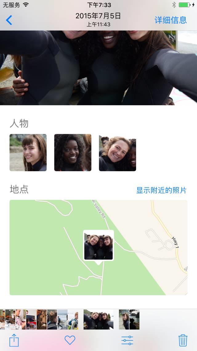4.当某天翻看以前拍摄的照片时,会不会想不起是在哪里拍摄的呢?iPhone升级到iOS10后,在阅览照片时,按住照片往上滑动,你可以看到该照片的拍摄地点了哦。