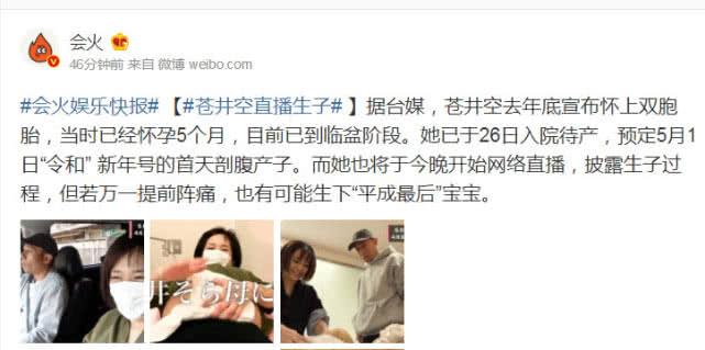 4月30日,港媒向外界透露了苍井空在26日住院的消息,将在5月1日当天直播剖腹产,而时间算起来也就9个小时了,自从苍井空宣布怀孕后,日本公司把苍井空所有的电影全部下架不在出售,有时候真的挺佩服日本的,祝苍老师安好。