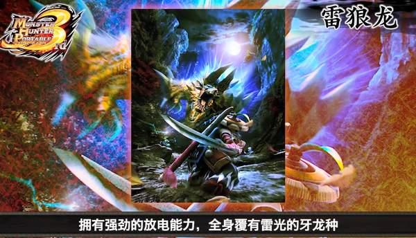 雷狼龙身上缠绕著雷光的牙龙种,初次登场于《怪物猎人P3》。善用被称为“蓄电壳”的甲壳和带电毛,把电力蓄至极限的状态名为“超带电状态”,令人无比畏惧。